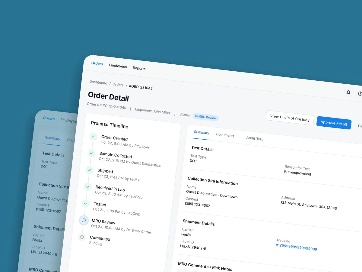 - Connected with multiple laboratories and the Medical Review Officer (MRO) system.